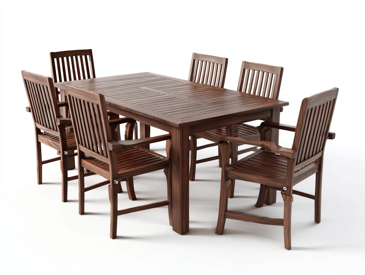La mesa rectangular ofrece un espacio amplio para colocar alimentos, bebidas y utensilios durante reuniones al aire libre. Las seis sillas cuentan con respaldo de listones verticales que proporcionan apoyo cómodo para la espalda. El conjunto está pensado para ofrecer comodidad y funcionalidad en zonas de comedor exteriores.